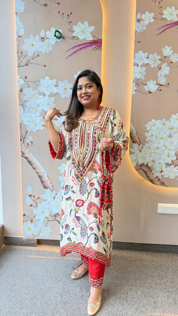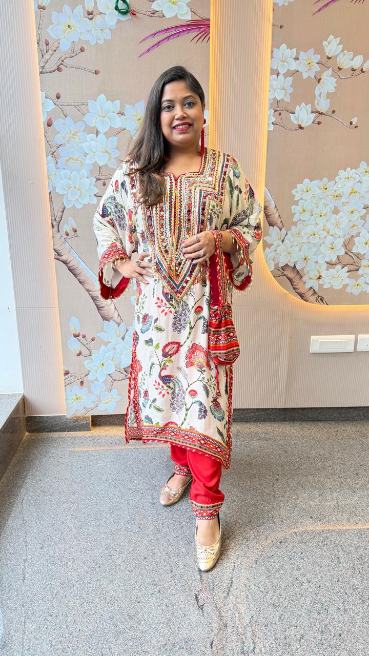 Restocked! Wow premium pure crepe designer co ord set with gotta detailing and real mirror. It comes with potli. Dispatch in next 15-20 days