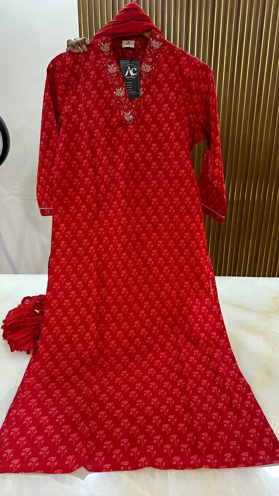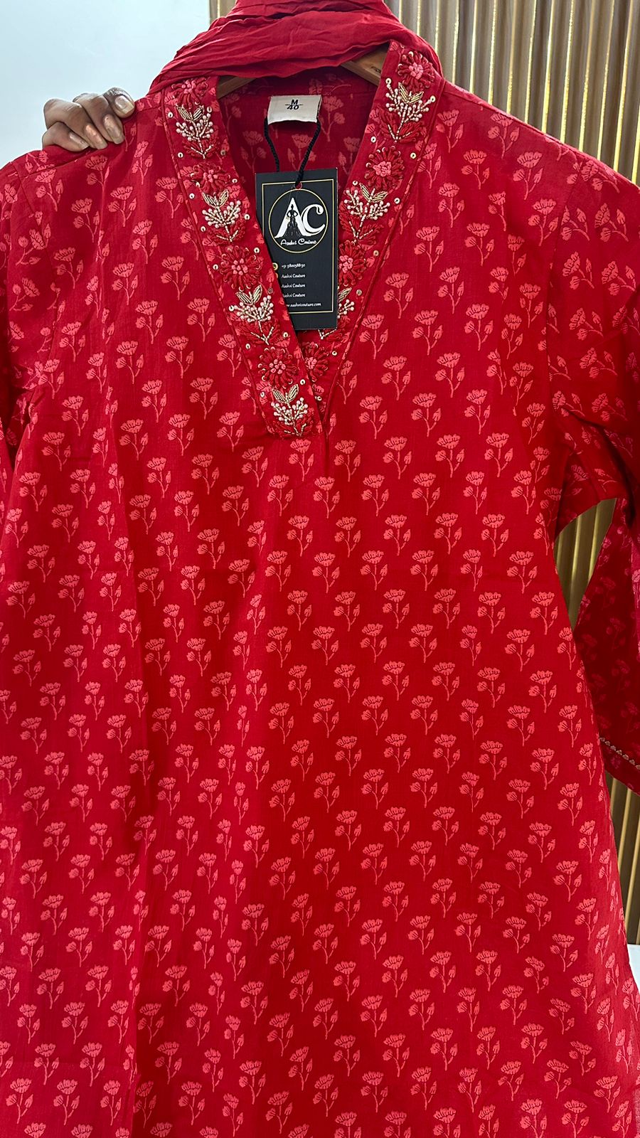 Wow V neck cotton suit paired with crushed cotton dupatta