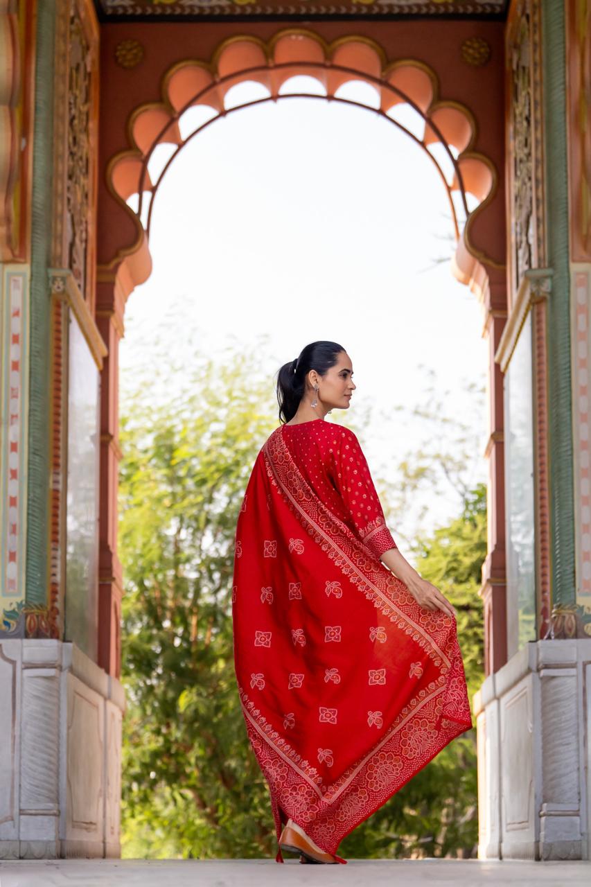 Pretty muslin bandhani suit set in red