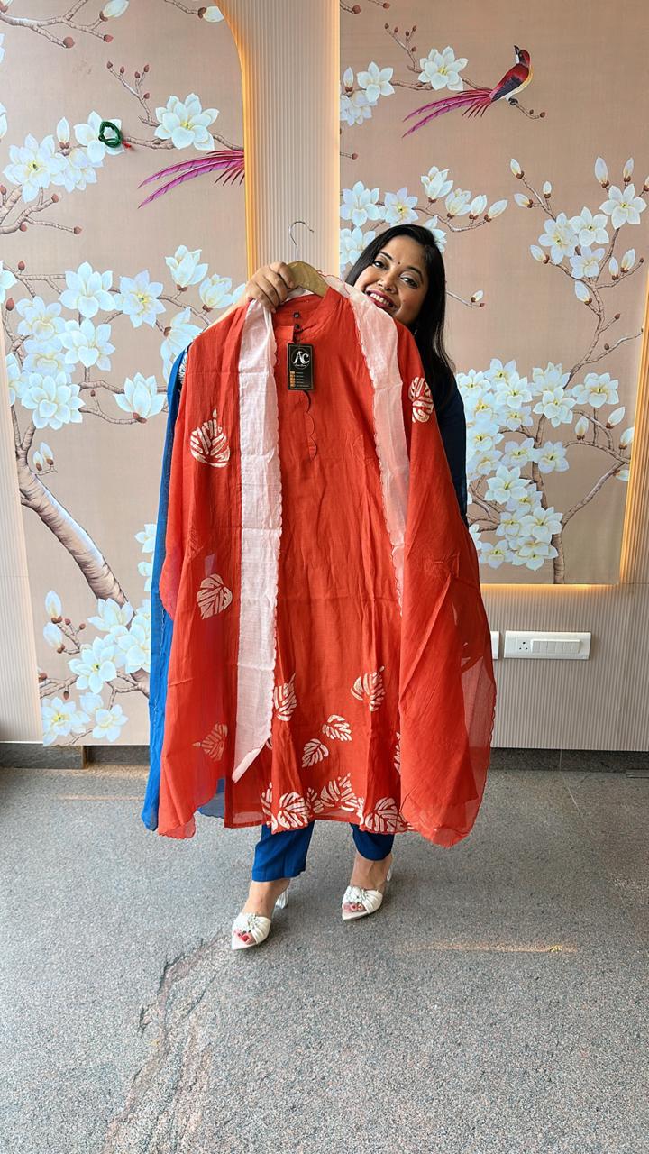 Smart n designer pure appliqué work Mul Chanderi suit set in rust