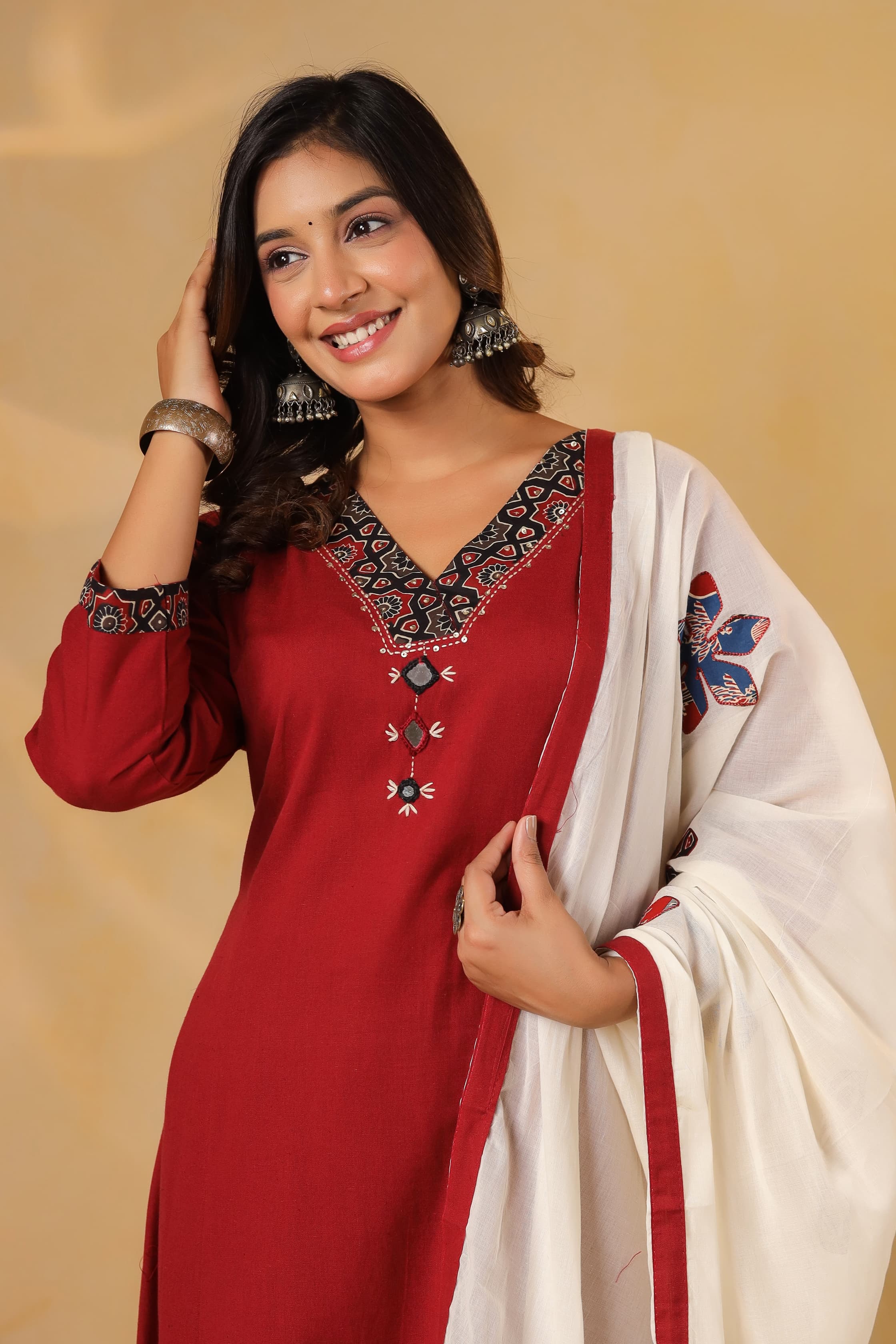 Pure cotton appliqué suit set paired with super soft dupatta in red