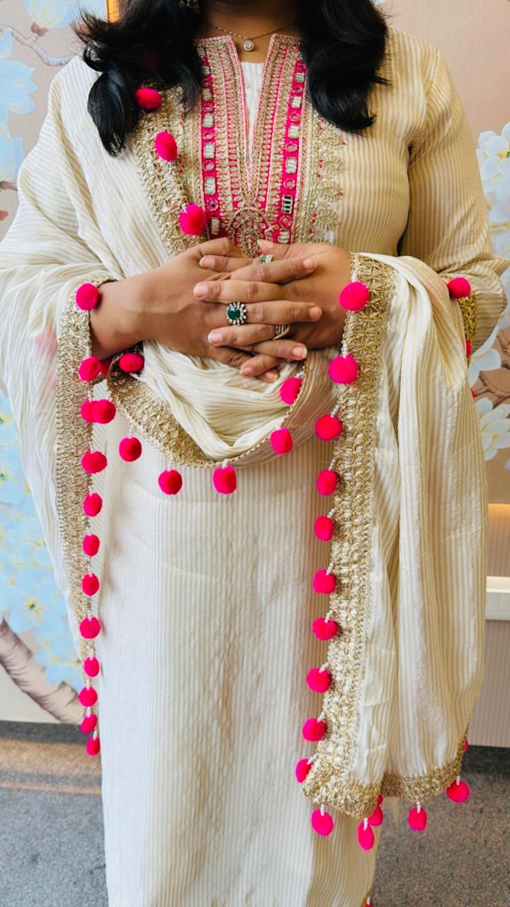 Super smart shimmer tissue suit with Pom Pom lace detailing in pink (advisable to go for a size up )