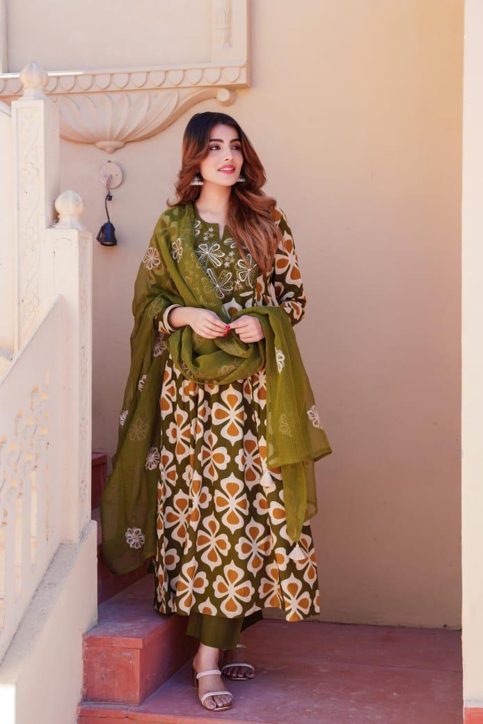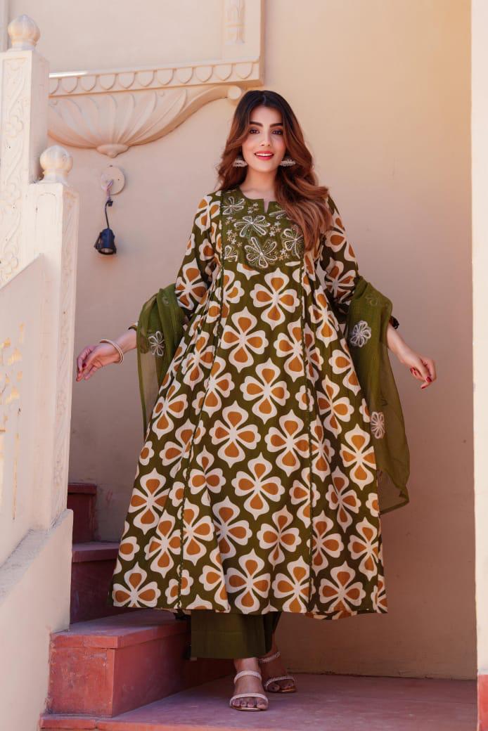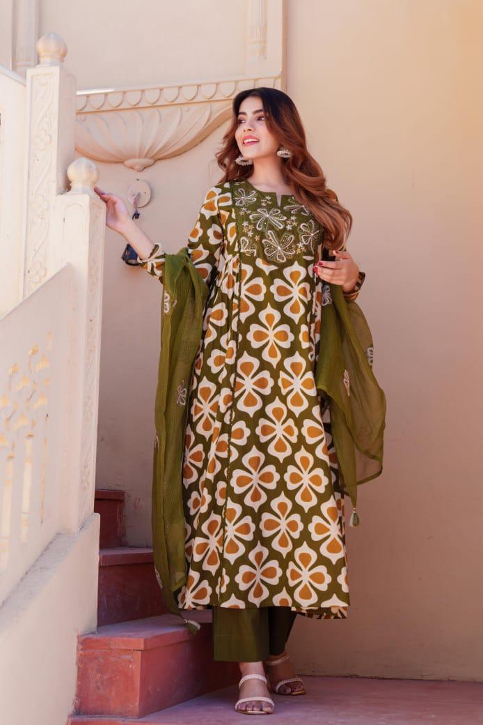 Digital printed full suit set paired with embroidered Kota doria dupatta