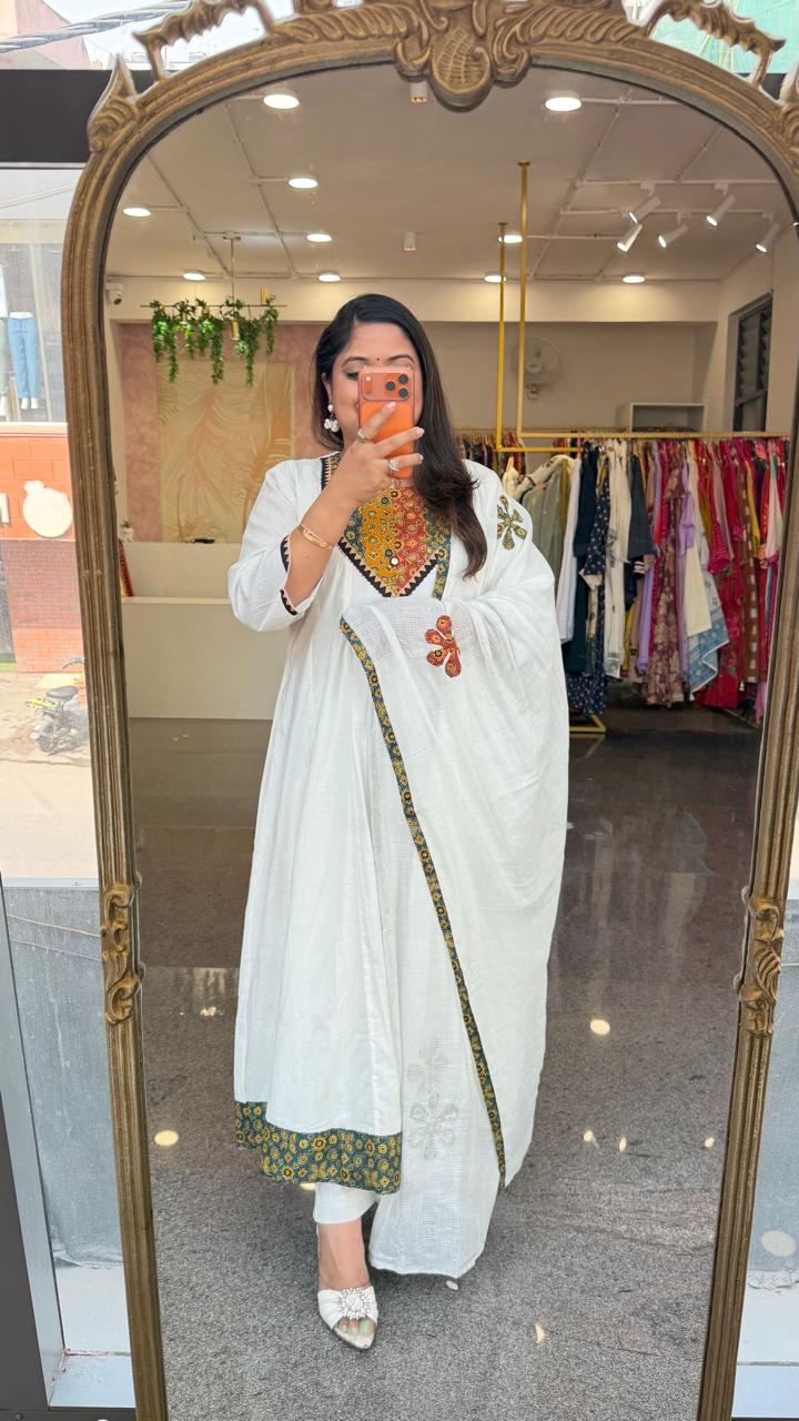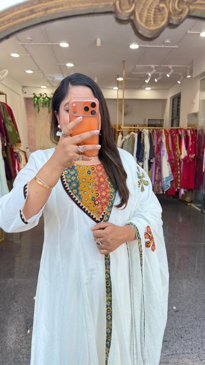 Mul Mul cotton lining applique work full suit set in green. Kurta has pocket too