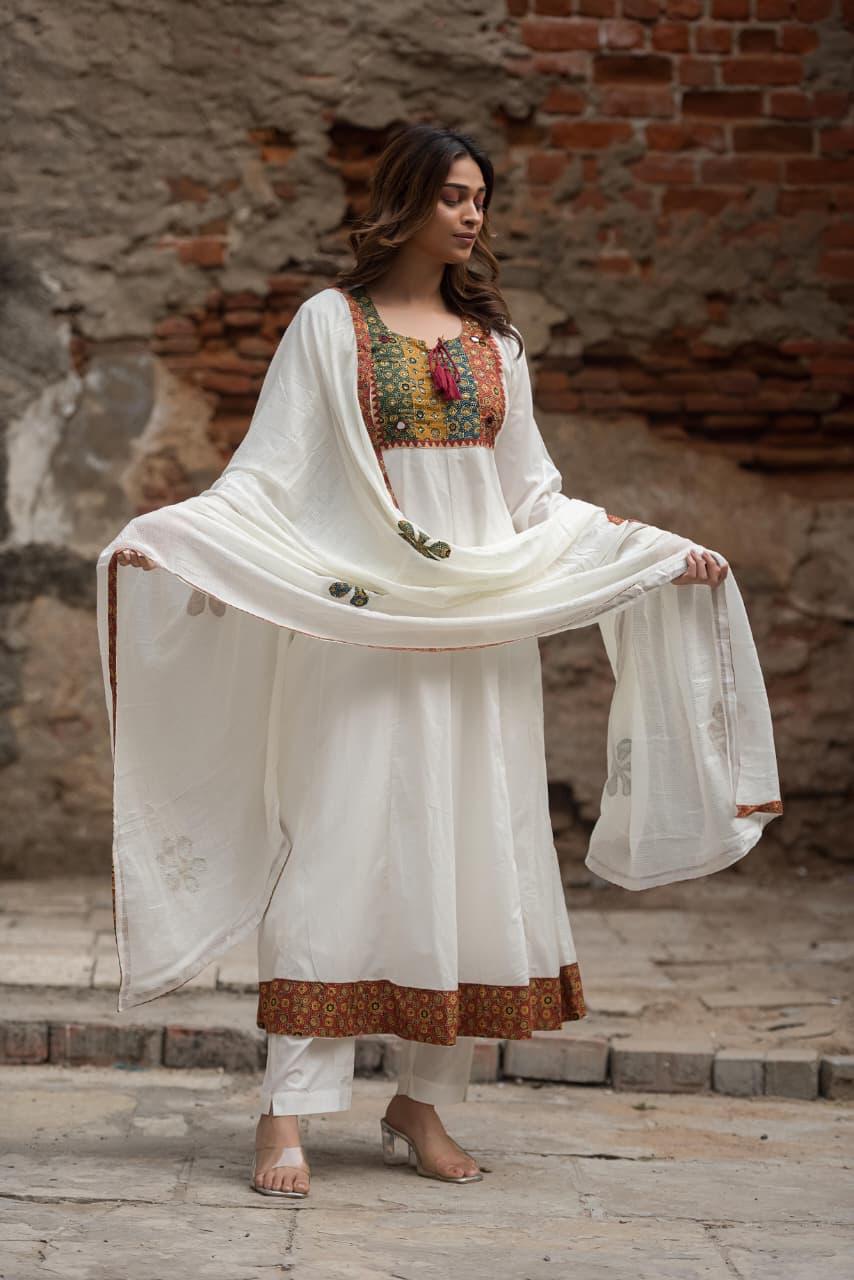 Mul Mul cotton lining applique work full suit set in orange. Kurta has pockets too