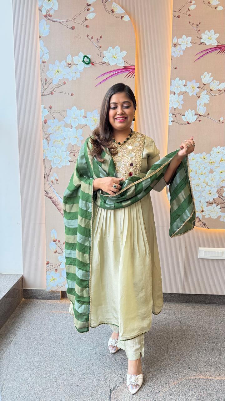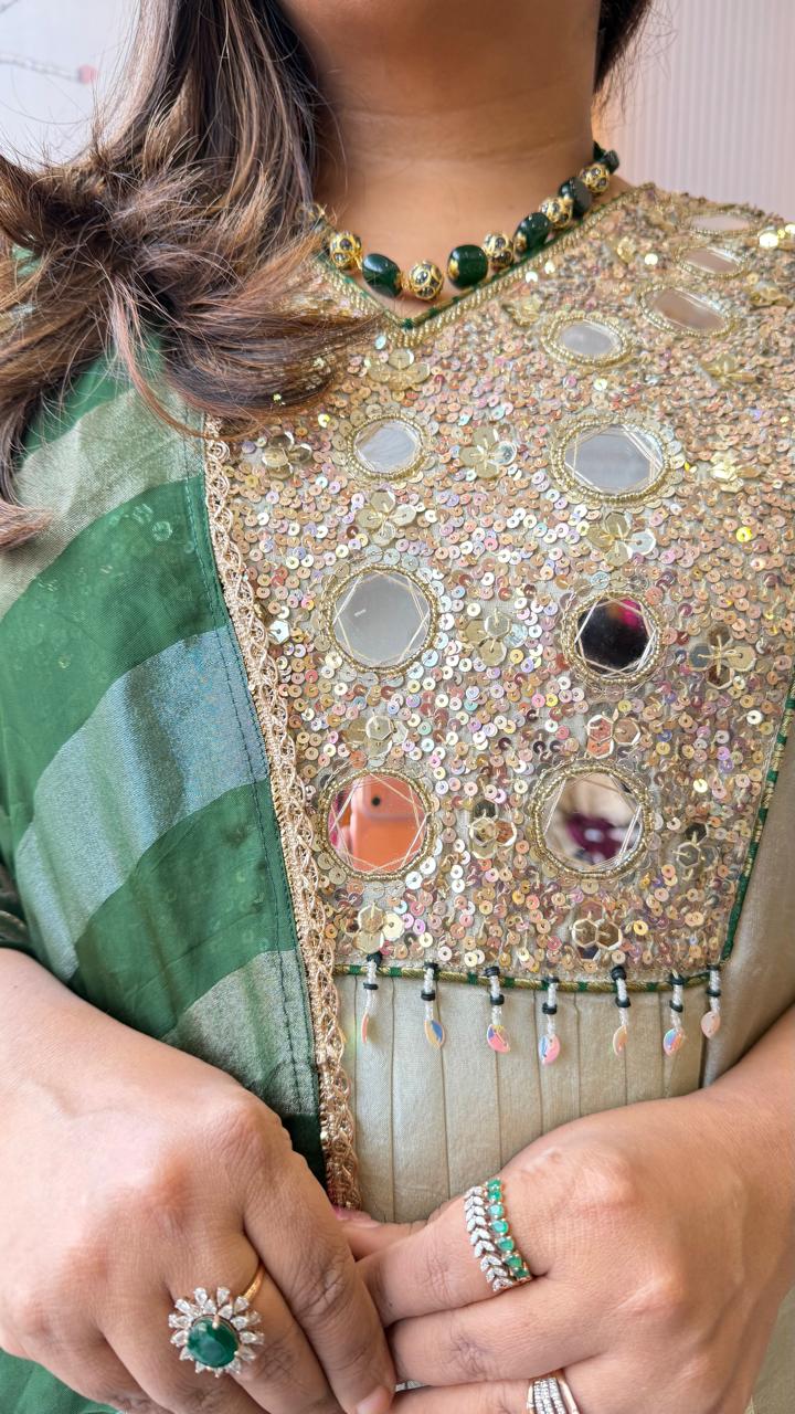Premium tissue real mirror work suit set in green